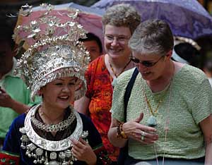 | 兩名外國旅游者在凱里市南花村同當地苗族婦女交流。攝影/楊俊江 | “最具吸引力的旅游勝地”