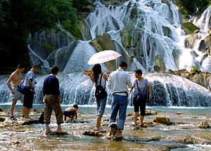 游客在平塘縣甲茶瀑布旅游。攝影/楊俊江 |