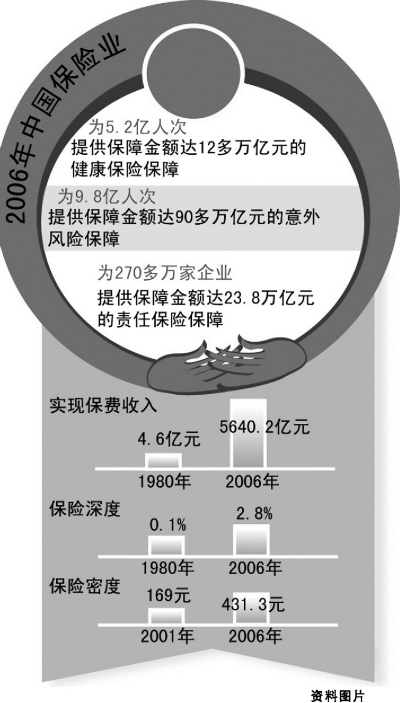 2006年,中國保險業共為9.8億人次提供保障金額達90多萬億元的意外風險保障,為5.2億人次提供保障金額達12多萬億元的健康保險保障,為270多萬家企業提供保障金額達23.8萬億元的責任保險保障……這些龐大數字的背后是一個新興保險市場迅速成長的縮影。 在發達國家,保險已滲透到經濟的各行各業、社會的各個領域和人們生活的各個方面。但是由于歷史原因,新中國保險事業一度進入長達20年的停頓期。直到中國實行改革開放,保險業全面恢復以后,才真正步入蓬勃發展的軌道。