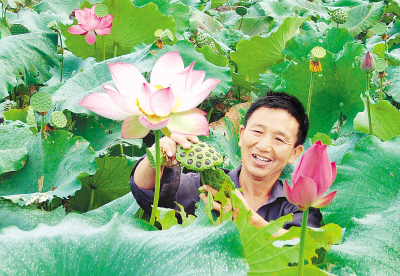 圖為九月十二日,大觀村農民毛得貴在采摘第二批太空蓮。