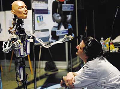 2007年美國電子科技成果展日前在洛杉磯會議中心開幕。美國電子科技成果展由美國著名科技雜志《連線》從2004年開始每年舉辦一次,其主要目的是為當今世界電子科技研究的新潮流、新思想和新成果提供展示平臺。圖為一名參展技術人員與一臺機器人“交談”。