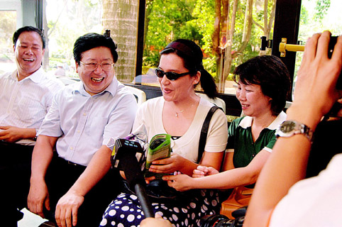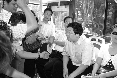 昨日上午9時35分,來自武鳴的鄧永玉抱著一歲半的孩子在民族大道登上一輛211路公交車。在道了一聲“謝謝”后,她自然地坐在了一名中年人主動讓出來的位置上——經常帶孩子出門,經常乘公交車,也經常得到別人讓座的“禮遇”,鄧永玉已經“習慣成自然”。 但鄧永玉怎么也想不到,這次給自己讓座的人竟是市長陳向群。在南寧市首屆“城市公共交通周及無車日”活動的第一天,陳市長搭上一輛211路公交車返回市政府,實實在在地當了一回“公交一族”,不僅用實際行動倡導“無車日”,還留下了一車佳話。 上午9時25分左右,“無車日”活動儀式啟動后,陳市長便來到民族廣場公交站臺等車,準備搭211路公交車回市政府!澳壳肮卉嚿系男⊥刀嗖欢?坐公交車方不方便?”在站臺上,陳市長向候車的市民了解情況,同時勸導市民站到站臺上,不要把公交車的路給堵了。 9時29分,一輛211路公交車駛進站臺。此時,車上已有不少乘客。陳市長與其他乘客一起上了車。為了不驚動司機與其他乘客,陳向群與普通乘客一樣,主動投幣后就悄悄選擇一個靠近前門的空位坐了下來。很快,車上已擠滿了一車人。 9時35分,211路公交車靠站停車,來自武鳴縣城的鄧永玉抱著一個一歲半的小孩子上公交車后,享受到了“特殊”的待遇:市長讓座。從交談中,得知給自己讓座的是市長后,她激動地說:“我真想不到,給我讓座的會是市長!這個"綠色出行"活動真是好啊,不僅方便我們乘客出行,也可以讓我們和市領導同坐一輛公交車,體會到領導對我們老百姓的體恤和關心! 同時,陳市長身邊的工作人員也把空位讓給了一名剛上車的小伙子。小伙子叫廖宇,他顯得有些不好意思:“長這么大,還是頭一次與市長同乘一輛公交車,覺得很榮幸,也很感動! 一路上,陳市長與同車的乘客們聊起了南寧交通狀況。在寶資通公司工作的廖宇告訴市長,他的煩惱是每次坐公交車都擁擠,有時累得滿頭大汗,上下班時就更擠了。陳市長說,今后,市政府將堅持優先發展城市公交戰略,從資金、土地、政策等方面大力扶持公共交通發展,改善公交服務設施和服務環境,為廣大市民創建環保、健康、安全、暢通的公交出行環境。 9時50分,211路公交車開到市政府站。一位80多歲的阿婆下車不方便,陳市長忙上前,小心地攙著老人一步步走下公交車!皠e急,我扶您,慢慢下車!标愂虚L輕聲對老太太說。等到老人站穩后,陳市長才輕輕地把手放開。