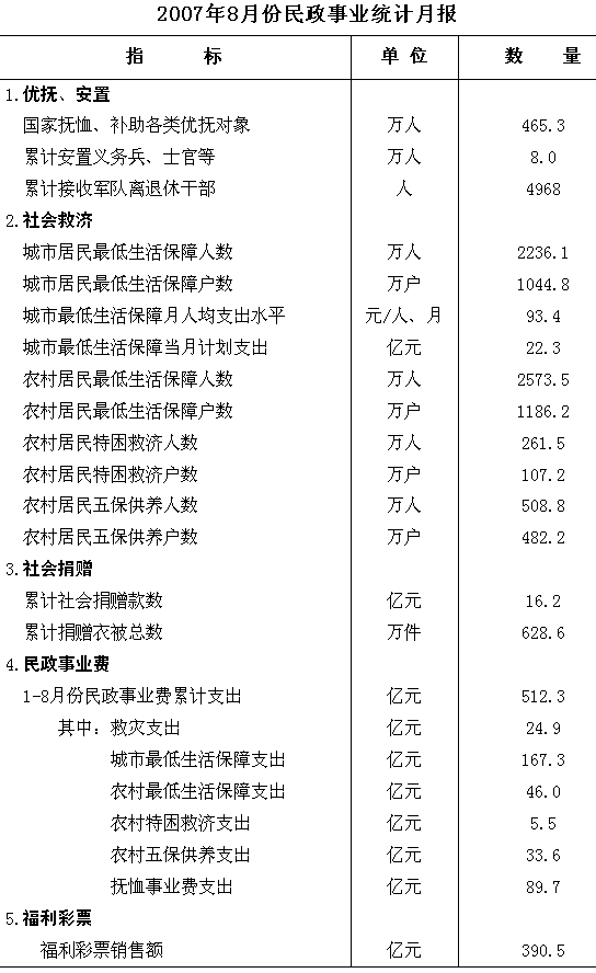 于其網站上公布了2007年8月份民政事業統計月報,詳情如下。