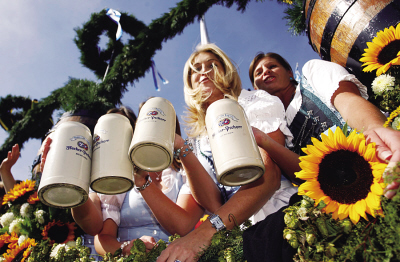 第一百七十四屆慕尼黑啤酒節日前在德國巴伐利亞州慕尼黑開幕。德國慕尼黑啤酒節享譽世界,從每年9月的第三個星期六開始,到10月的第一個星期日結束。圖為幾名女服務員身穿巴伐利亞傳統服裝參加慕尼黑啤酒節開幕游行。