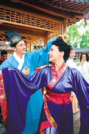 來自烏克蘭的留學生阿里克斯(左)和丹尼婭(右)試穿中國漢服。