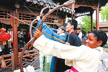 來自烏克蘭的留學生阿里克斯(左)和來自津巴布韋的安德莉(右)在體驗中國傳統的射禮。