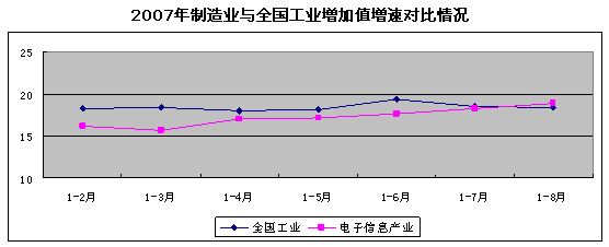 今年1-8月我國電子信息全行業繼續保持平穩發展,總量增速小幅上升,規模以上制造業經濟效益穩步回升。1-8月全行業實現主營業務收入29929.2億元,同比增長19.4%,其中制造業實現主營業務收入26490.3億元,同比增長19.0%;軟件業實現收入3438.9億元,同比增長22.9%。制造業實現工業增加值5794.0億元,同比增長18.9%;實現利潤922.1億元,同比增長25.6%;實現稅金307.2億元,同比增長18.5%。