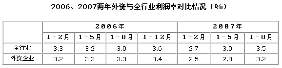 1.外資企業利潤率低于全行業平均水平。1-8月外資企業實現659.5億元,同比增長15%,低于全行業平均增速10.6個百分點,占全行業比重71.5%,比1-5月的75.3%下降3.8個百分點。自去年年底以來外資企業利潤率開始低于全行業利潤率水平,從今年2月、5月、8月數據看,這種局面不但沒有得到改善,反而有逐步擴大的趨勢。
