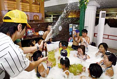 啤酒溫泉浴近來風靡日本。在某些體育項目比賽中,勝利者通常在賽后以噴灑啤酒的方式慶祝勝利,啤酒溫泉浴的創意就來源于此。圖為在日本神奈川縣箱根町的溫泉勝地,人們享受啤酒溫泉浴。