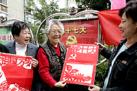 | 北京朝陽區六里屯街道退休老教師孫慧敏(左二)現場展示紙剪作品“ 喜迎十七大”和“祖國萬歲”,表達迎接十七大的喜悅心情。 |