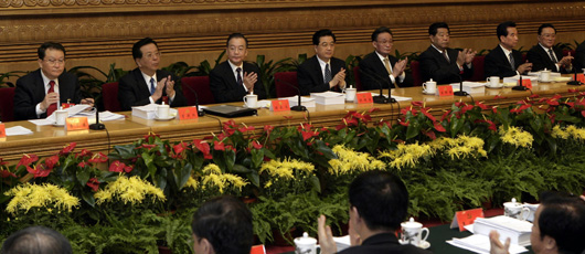 | 10月17日,中國共產黨第十七次全國代表大會主席團在北京人民大會堂舉行第二次會議。胡錦濤、吳邦國、溫家寶、賈慶林、曾慶紅、吳官正、李長春、羅干等出席會議。 |