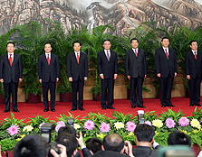 剛剛在黨的十七屆一中全會上當選的中共中央總書記胡錦濤和中央政治局常委吳邦國、溫家寶、賈慶林、李長春、習近平、李克強、賀國強、周永康,22日上午在人民大會堂同采訪黨的十七大的中外記者親切見面。 人民大會堂東大廳華燈璀璨,鮮花綻放,氣氛熱烈莊重。600多名中外記者早早來到這里。他們架起一排排攝像機、照相機,手持錄音機、采訪本,等待著新一屆中共中央政治局常委會組成人員的到來。[詳情] | |