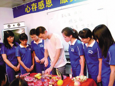 會做西餐,能講外語,深圳涉外管家培訓班的“洋保姆”們在上調酒課。 | 隨著中國經濟的迅速發展,漢語受到許多國家的重視。加上遍布世界的華人家庭的需要,高素質的中國保姆開始走俏。受過專業培訓的涉外保姆走向海外,在家政業大展拳腳。
