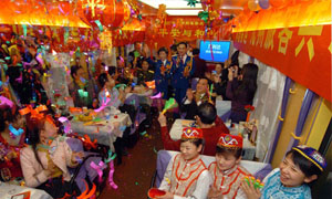 圖為在T69次列車上舉辦的“春節晚會”現場(2007年2月17日攝)。2月17日除夕夜,在北京開往烏魯木齊的T69次列車上舉辦了一場別開生面的列車“春晚”。列車乘務員自編自演節目,與旅客聯歡,共除舊歲! ⌒氯A社記者