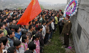 4月5日,在貴州省遵義縣南白鎮后壩紅軍烈士墓,遵義縣人武部政委朱松山(右)正在給后壩長征希望學校的學生講述紅軍長征的故事! ⌒氯A社記者
