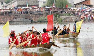 6月19日,農民代表隊激烈角逐。當日,在浙江省蘭溪市赤溪街道楊塘楊大湖,附近九個村莊的農民進行端午龍船賽! 。ū緢筚Y料照片)