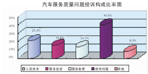 2007年三季度,全國汽車售后服務質量投訴表明,服務收費、服務態度和配件供應在服務質量投訴中占到70%以上。 同一故障在反復修理過程中,消費者對工時等費用該由誰承擔的反映仍十分突出;而配件方面的投訴主要表現在配件供應的及時性、配件價格過高及質量不能保證等方面。 其中,對服務質量的投訴反映較多的主要是維修養護時的配件問題,占40.5%。其問題主要表現為以次充好,質量不過關等。