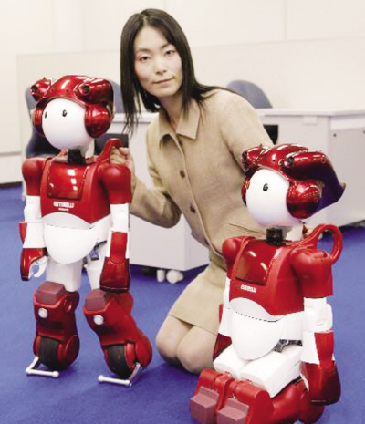 在日本茨木的日立公司實驗室,工作人員展示該公司新研制出的“EMIEW2”機器人。它們不僅同上一代一樣擁有卓越的靈活性,能夠與人協同工作,而且新增了可變的“腿腳”,能夠在車輪和雙足之間自由交換。