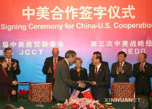11日下午,中美雙方在釣魚臺國賓館舉行了中美經貿合作簽字儀式。國務院副總理吳儀和美國財政部長保爾森、商務部長古鐵雷斯、衛生部長萊維特等出席了簽字儀式。