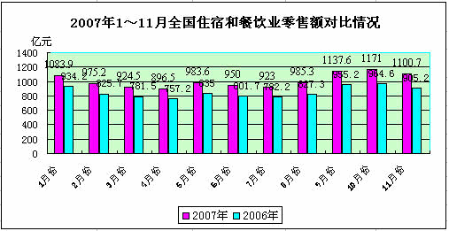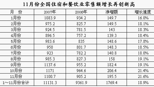 今年11月份,全國住宿與餐飲業零售額實現1100.7億元,比去年同期增長21.6%,增幅高出3.9個百分點,比上月增幅高出0.2個百分點,再創今年新高。今年1-11月份,全國住宿與餐飲業零售額累計實現11131.3億元,同比增長18.9%,比去年同期增幅高出2.7個百分點,占社會消費品零售總額的13.9%,拉動社會消費品零售總額增長2.6個百分點,對社會消費品零售總額的增長貢獻率為15.7%。 1-11月份,住宿與餐飲業新設立外商投資企業862家,同比下降11.9%;合同外資金額32.6億美元,同比增長29.6%;實際使用外資金額7.9億美元,同比增長8.3%。 從限額分類看,1-11月份,限額以上住宿與餐飲企業零售額3294.1億元,同比增長18.8%,占全國住宿與餐飲業零售額的29.6%。限額以下住宿與餐飲企業零售額7837.2億元,同比增長18.9%,占全國住宿與餐飲業零售額的70.4%。
