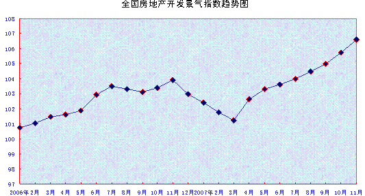 11月份,“國房景氣指數”為106.59,比10月份上升0.85點,同比上升2.67點。 房地產開發投資分類指數為104.53,比10月份上升0.11點,同比上升3.07點。1-11月份,全國完成房地產開發投資21632億元,同比增長31.8%。住宅完成投資15440億元,增長33.7%。其中,經濟適用住房投資693億元,增長31.7%。 資金來源分類指數為107.93,比10月份上升3.03點,同比上升4.63點。1-11月份,全國房地產開發企業資金來源為32043億元,增長40.8%。其中,國內貸款為6098億元,增長32%;利用外資539億元,增長71.9%;企業自籌資金10272億元,增長38.5%。 土地開發面積分類指數為98.04,比10月份上升0.42點,同比回落3.49點。1-11月份,全國房地產開發企業完成土地開發面積2.14億平方米,增長8%。 房屋施工面積分類指數為105.54,比10月份下降0.10點,同比上升2.78點。1-11月份,全國房屋施工面積21.66億平方米,增長23.0%。其中,住宅施工面積17.11億平方米,增長24.2%;辦公樓施工面積7930萬平方米,增長18.4%;商業營業用房施工面積2.39億平方米,增長12.4%。 商品房空置面積分類指數為111.97,比10月份上升1.26點,同比上升6.54點。截止到11月末,全國商品房空置面積為11797萬平方米,同比下降4.5%。其中,空置商品住宅5766萬平方米,下降14.2%。