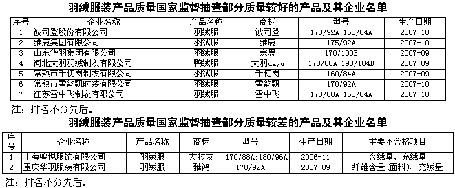 為保障消費者的合法權益,促進羽絨服裝行業的健康發展,國家質檢總局組織對羽絨服裝產品質量進行了國家監督抽查,共抽查了北京、天津、上海、重慶、江蘇、浙江、江西、湖北、河北等8個省、直轄市50家企業生產的50種產品(不涉及出口產品),產品實物質量抽樣合格率為99.1%。