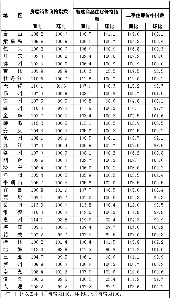 一、新建商品住房銷售價格同比上漲11.4%,漲幅比上月低0.8個百分點;環比上漲0.3%,漲幅比上月低0.7個百分點。分類別看,經濟適用房、普通住房和高檔住房銷售價格同比分別上漲3.9%、12.1%和11.8%,環比分別上漲0.0%、0.3%和0.2%。分地區看,同比漲幅較高的主要城市包括:烏魯木齊25.3%、北海19.3%、惠州19.0%、北京17.5%、南寧17.4%、寧波17.3%、蘭州16.7%、重慶15.9%和長沙15.1%等;環比漲幅較高的主要城市包括:?