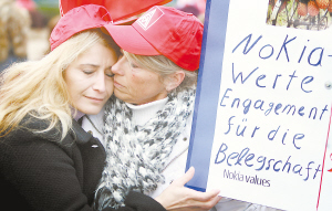 1月16日,諾基亞德國工廠的數名員工走上街頭抗議,希望諾基亞考慮工人權益。芬蘭手機制造商諾基亞日前表示,將關閉德國Bochum手機制造工廠并裁員2300人。諾基亞表示,Bochum已經喪失競爭優勢,市場變化和成本效率要求的提高意味著諾基亞在德國生產手機已經不切合實際。諾基亞之前也曾表示,將與雇員代表進行談判,爭取與每位雇員達成滿意的解決方案。東方IC/供圖