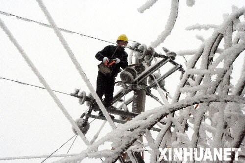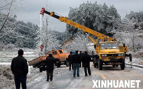 | 1月20日,黔東南州錦屏縣電力職工搶修遭受冰凍災害的電力設施。
