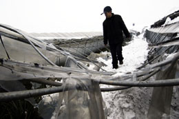 1月22日,安徽省舒城縣雙豐農業科技示范園的工人在整理被大雪壓塌的大棚。連日來,安徽部分地區持續降雪。大雪造成全省12個市受災,受災人口300多萬人,轉移安置4000多人,因災死亡1人,因災傷病14人。農作物受災面積200多萬畝,倒塌房屋3600多間,直接經濟損失4.3億元。新華社記者:李健 攝