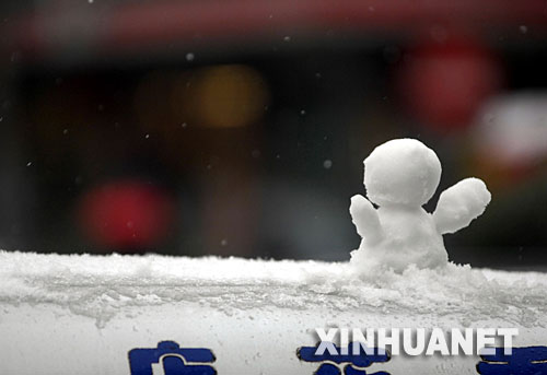 1月26日,停在杭州市區內的一輛車的車頂積雪被堆成了小雪人。新華社記者 徐昱 攝
