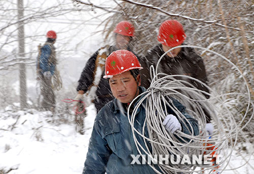| 1月28日,宣城供電公司水東供電所員工冒著大雪搶修線路。 新華社發(李曉紅