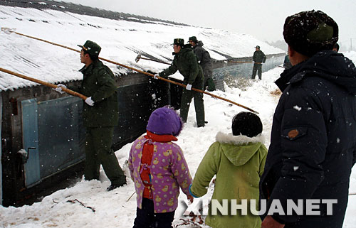 | 1月28日,在安徽省宣城市楊柳鎮華山村,武警官兵幫助村民清除積雪。當日,安徽省宣城市普降暴雪,宣城市楊柳鎮華山村一養殖戶飼養的2萬只雞被困在房屋里,武警宣城支隊官兵聞訊趕往現場,幫助當地群眾清理積雪、搶救財產。新華社發(廖福安