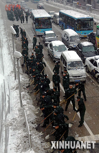 | 1月27日,武警安徽總隊合肥支隊的官兵在街道上除雪。當日,合肥再次降大到暴雪,造成市內道路積雪嚴重,交通受阻。為保障道路暢通和市民出行安全,合肥市各部門積極行動,武警安徽總隊合肥支隊也派出上千名官兵,同心同力,抗擊雪災。