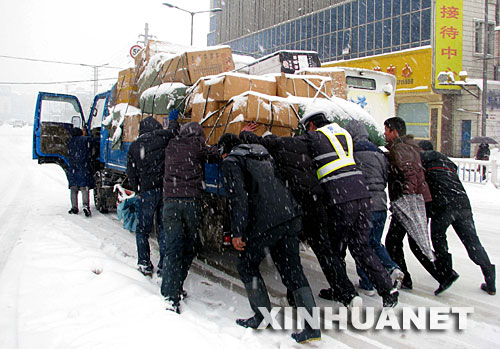 | 1月27日,市民和交警一起幫助推一輛拋錨的貨車。當日,安徽省蕪湖市出現暴雪天氣,當地汽車站客運全線停運。蕪(湖)馬(鞍山)、蕪(湖)宣(城)高速公路全部封閉,安徽氣象部門同時發布暴雪橙色預警和道路結冰黃色預警。新華社發 |