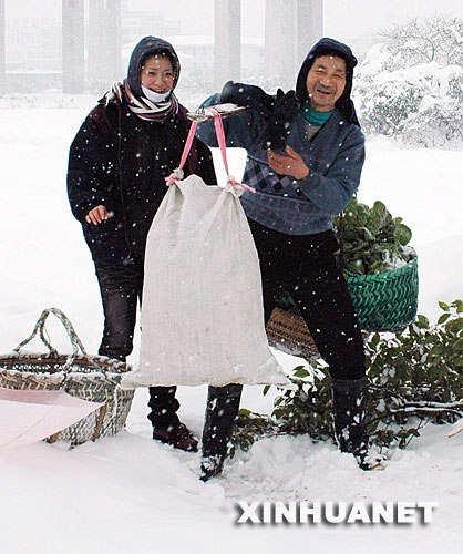 | 1月28日,菜農冒雪送菜到菜市。從1月26日起,安徽省蕪湖市連降大雪,道路交通受阻,菜市蔬菜供應緊缺。不少菜農冒雪送菜。新華社發(陳立希