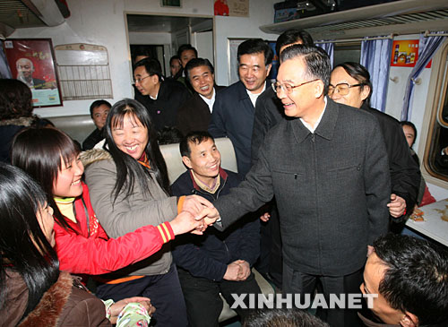 1月30日,中共中央政治局常委、國務院總理溫家寶在廣州火車站看望旅客。這是溫家寶總理登上一列即將發往南昌的火車與旅客交談。