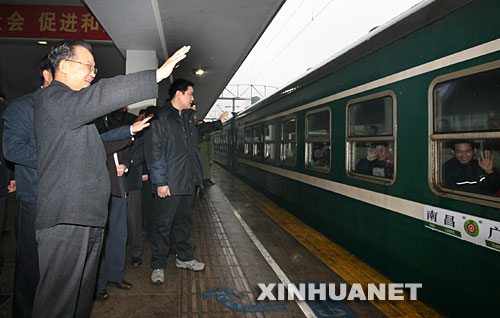 這是溫家寶總理在站臺上為一列發往南昌的旅客列車送行。