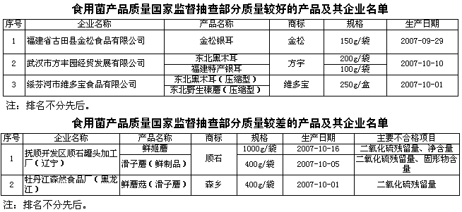 此次抽查依據GB7096-2003《食用菌衛生標準》、GB2760-1996《食品添加劑使用衛生標準》、GB7718-2004《預包裝食品標簽通則》等強制性國家標準規定的要求,對食用菌產品的感官要求、水分、總砷、鉛、總汞、六六六、滴滴涕、二氧化硫殘留量、山梨酸、苯甲酸、干濕比、粗蛋白質(蛋白質)、總糖(糖分)、粗纖維、灰分、凈含量、固形物含量、微生物指標(大腸菌群、致病菌)以及食品標簽等20個項目進行了檢驗。經檢驗,涉及人身健康的主要安全項目大腸菌群、致病菌、重金屬含量等指標全部符合國家標準規定的要求。