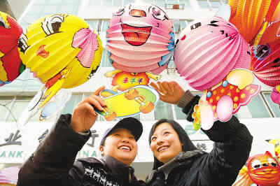 傳統節日元宵節來臨之際,安徽省淮北市街頭,五彩繽紛的花燈十分俏銷,市民們紛紛選購花燈迎接元宵節。圖為二月十八日,兩位姑娘在挑選自己喜愛的卡通燈。