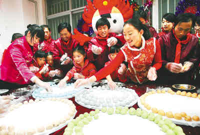 師生們為工人師傅表演了精彩的節目,還和工人們一起賞花燈、猜燈謎,一起動手包出象征奧運五環的五彩湯圓,共同祝福北京奧運,陶醉在喜慶祥和的節日氣氛中。