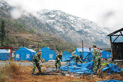 云南省怒江傈僳族自治州近日遭遇嚴重雪災。云南邊防總隊派出由1600余名官兵組成的搶險救災突擊隊,參加搶險救災。圖為官兵為災民搭建帳篷。