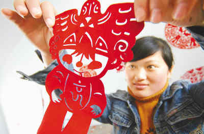 3月3日,一名聾啞學生展示奧運題材的剪紙作品。