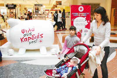 3月8日,人們走過塞浦路斯首都尼科西亞一個商場內設立的超大豬形儲錢罐。當日,當地狂歡節進入高潮,紅十字會借機推廣“零錢獻愛心”活動,呼吁民眾將家中零散的舊硬幣捐獻出來用于慈善事業。