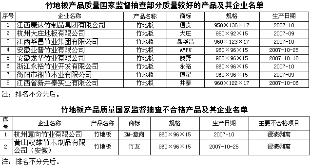 為了保障消費者的合法權益,促進竹地板行業健康發展,國家質檢總局組織對竹地板產品質量進行了國家監督抽查,共抽查了浙江、安徽、湖南、江西等4個省50家企業生產的50種產品(不涉及出口產品),產品實物質量抽樣合格率為94.2%。