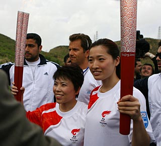 | 3月24日,中國火炬手羅雪娟(圖右)在火炬傳遞過程中與鄧亞萍合影。新華社記者 畢明明