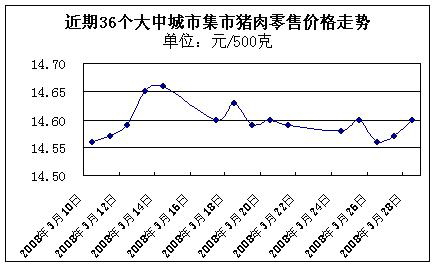 據國家發展改革委價格監測中心監測,上周(2008.3.24-2008.3.28,下同)全國36個大中城市集市豬肉(精瘦肉)平均零售價格每500克為14.58元,比前一周(2008.3.17-2008.3.21,下同)下降0.14%。