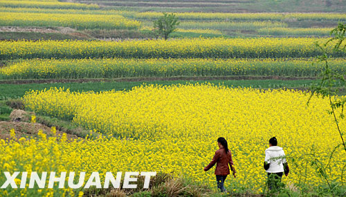 4月1日,在湖北省京山縣孫橋鎮,兩位村民在油菜花盛開的田間行走。