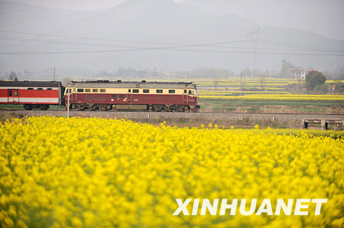 4月1日,一列火車從湖北省京山縣盛開的油菜花旁駛過。