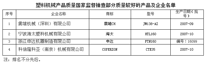 為維護消費者的合法權益,促進塑料機械行業健康發展,國家質檢總局組織對塑料機械產品質量進行了國家監督抽查。共抽查了上海、浙江、江蘇、廣東、福建、山東等6個省、直轄市30家企業生產的30種產品(不涉及出口產品),產品實物質量抽樣合格率為90%。